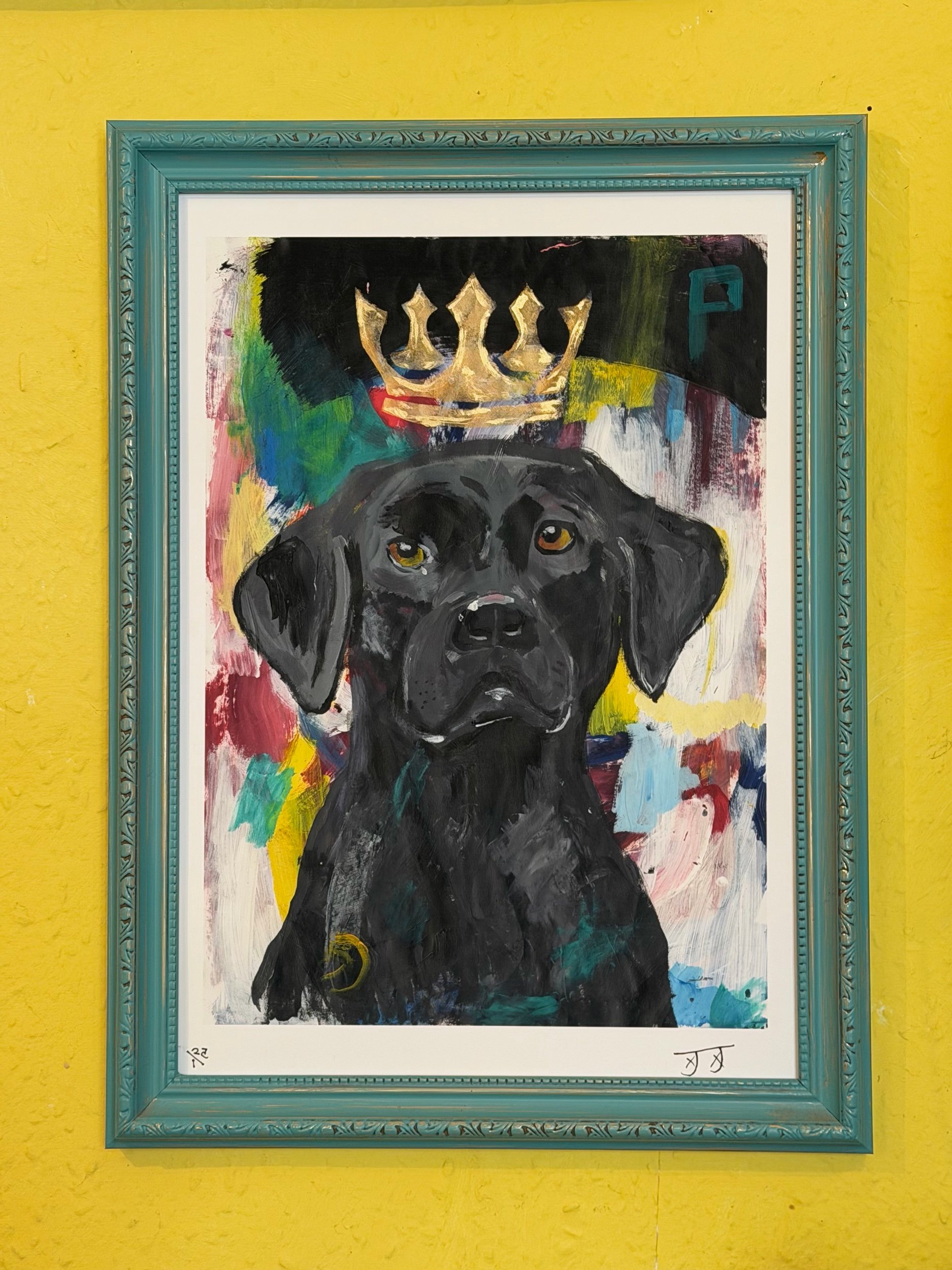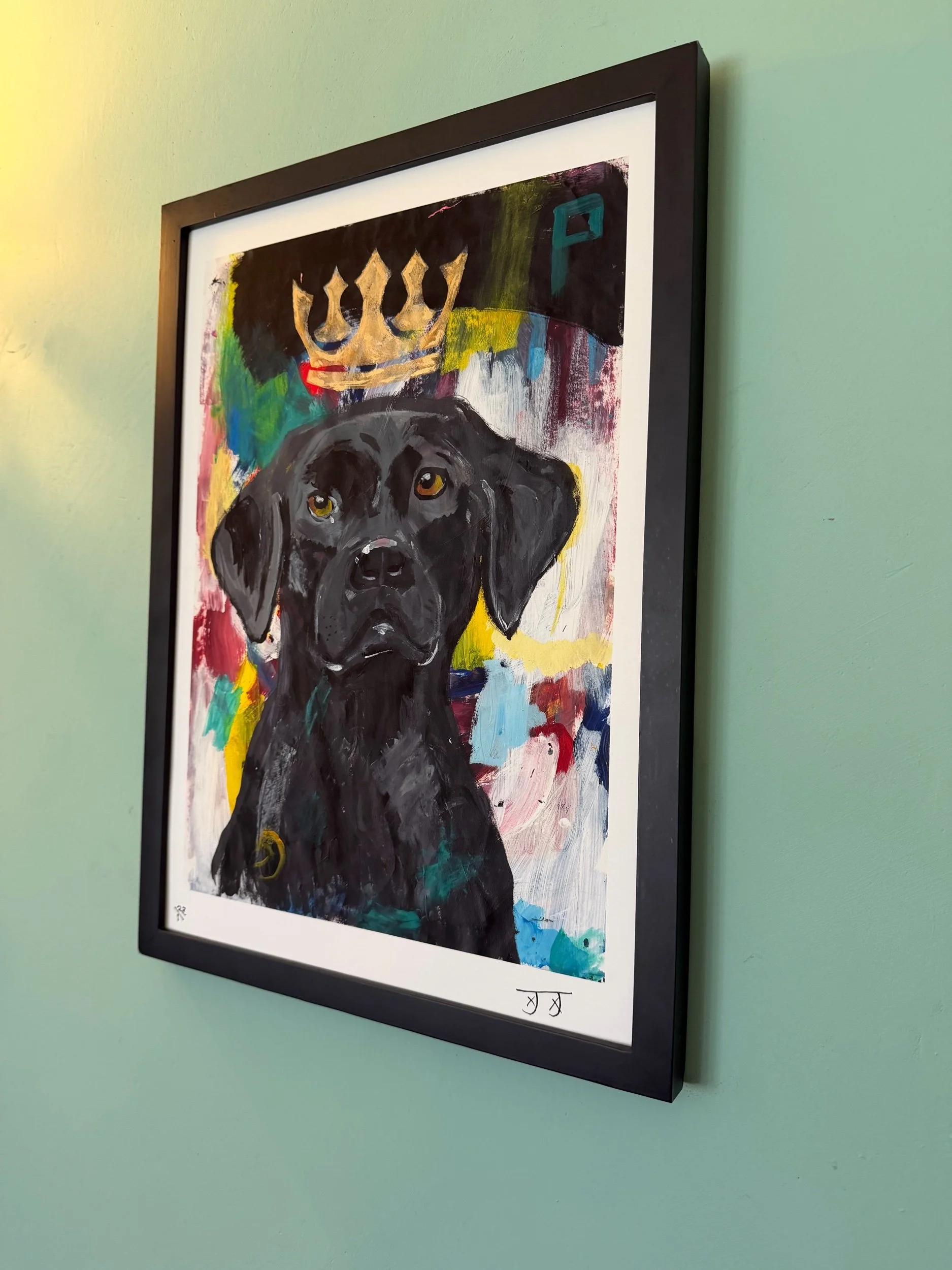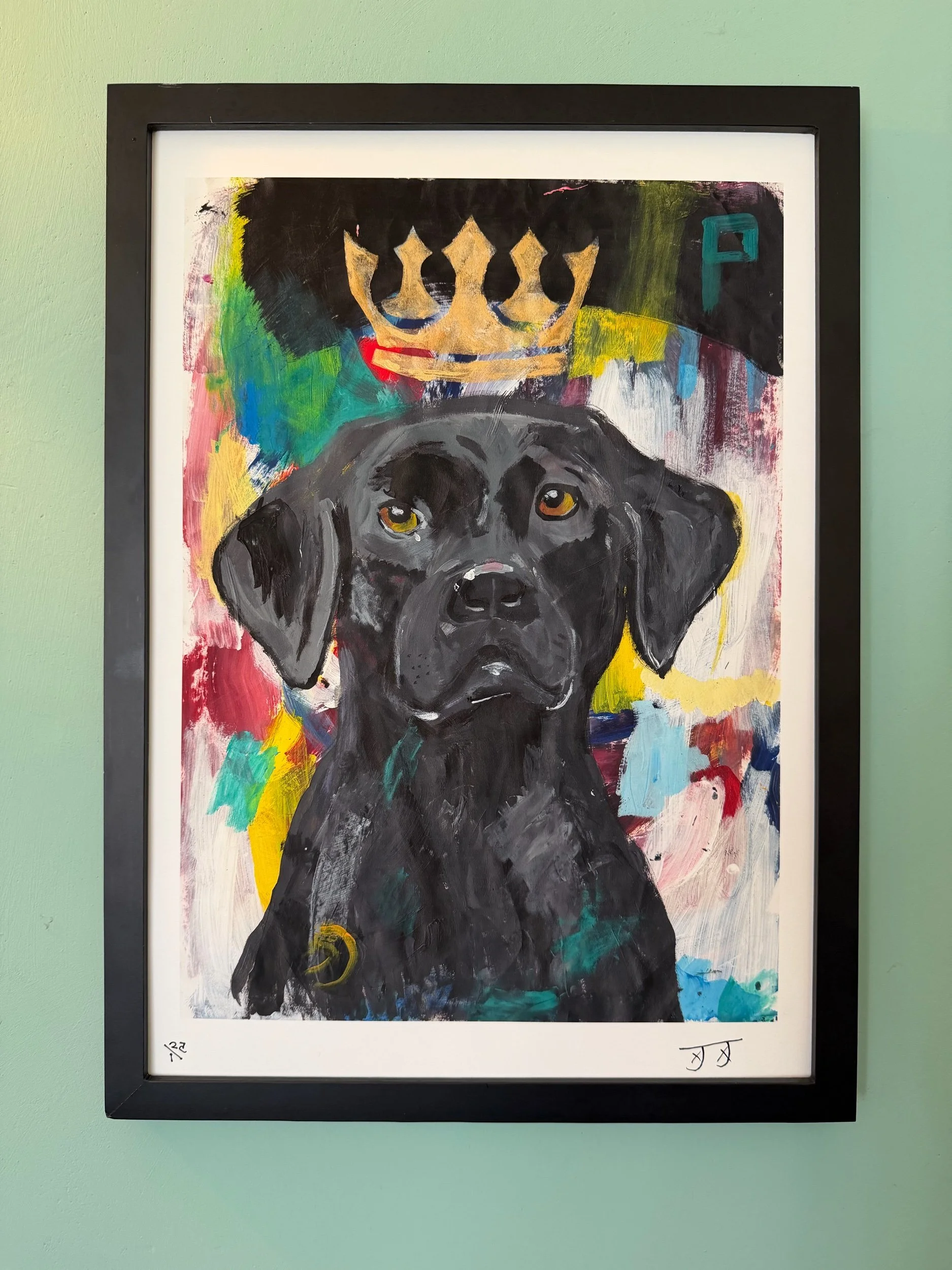 “King of the Catle” features a black lab puppy; the true king of the castle! Bright, block colours feel contemporary and playful- a wonderful print for anyone who’s ever had a puppy of their own.